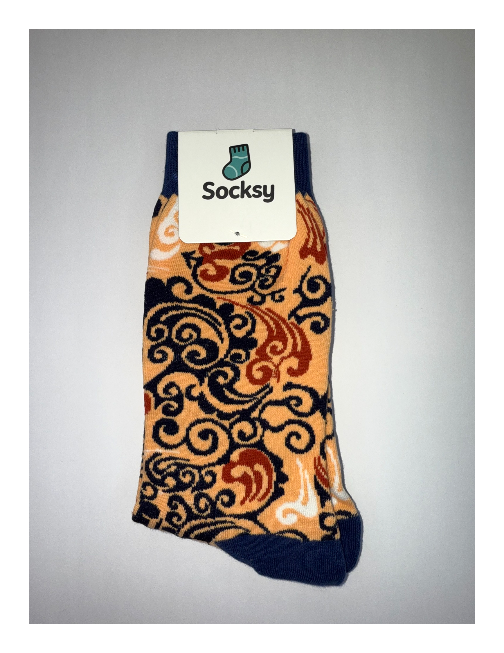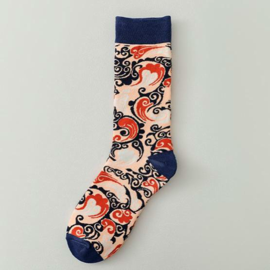 Subtle, intricate, and full of grace — Whispers in Silk is inspired by the delicate patterns found in heritage textiles and hand-painted scrolls. With swirling motifs in deep navy and crimson flowing across a soft blush canvas, these socks echo the quiet elegance of silk robes and ancient art.