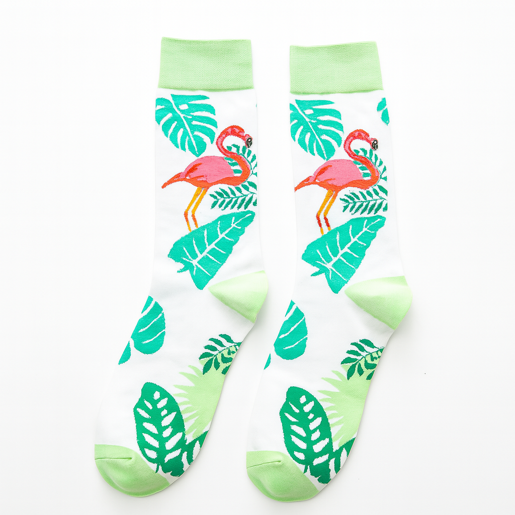 Let your feet take flight in FlaminGlow — the sock that brings paradise to your step. With elegant pink flamingos strutting through lush tropical leaves, this pair turns every day into a vacation mood. The soft mint green accents add a fresh, breezy vibe that’s perfect for lounging, strolling, or simply glowing up your outfit. Island energy? Always.